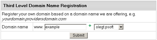If you are creating a regional domain (e.g. your_domain.uk) or would like to use a different domain registration company, no automation is provided. Thus, first you need to make sure that you have a valid domain name. Enter it into the lower box, omitting the www. part. Following the registration you will get an e-mail notification with the information to send to your domain name registration company. They will make appropriate changes on the root DNS servers, and within a couple of days your domain will be accessible at the new IP address. In the meantime, your site will be available by the instant domain alias. Domain registration is a standard procedure. First, you purchase a domain name from a domain registration company. Second, you register this domain name with your web-hosting provider and get your new IP address. Third, you send this IP address to your domain registration company, where it is set as the IP address for your domain name. It is only then that your site becomes available to all Internet community. This is true both of standard and nonstandard domains. In case of standard domain names, however, the registration process is automated. You can't transfer domains that are already in use in the system. Nor can you transfer third level domains if they use a second level domain owned by another user. Creating Domains Based on Your Provider's Domain Names (Third Level Domains) Third level domains are registered on your provider's DNS server. You don't need to register a third level domain with a domain registration company. If you choose to create a third level domain, it will contain your provider's domain name. E.g. if your provider's domain name is besthosting.com, and the third level domain you are registering is mythirdlevel, the fully qualified domain name would be mythirdlevel.besthosting.com. Third level domain registration is available only if it is allowed under the selected plan. Functionally, third level domains have same features as second level domains. To register a third level domain name, enter the desired domain name in the Domain name field. From the box on the right, select provider's domain name where you would like to create the third level domain:
