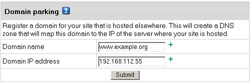 Parking External Domains This feature allows you to use H-Sphere DNS server to map IPs to domain names serviced and hosted on other servers (not those of H-Sphere). In this case, a DNS zone is created with a custom DNS A record for the domain name and its IP is entered in the form below:
